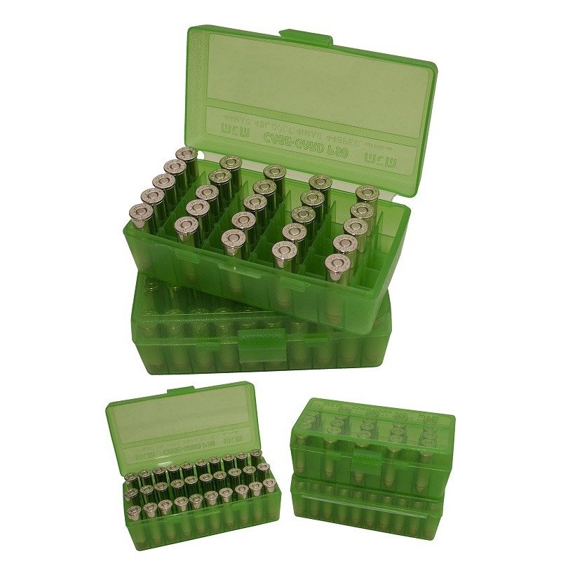 Boîte de rangement bleue pour 50 cartouches de 9 mm avec une ouverture à charnière garantie pour un million d'ouvertures.