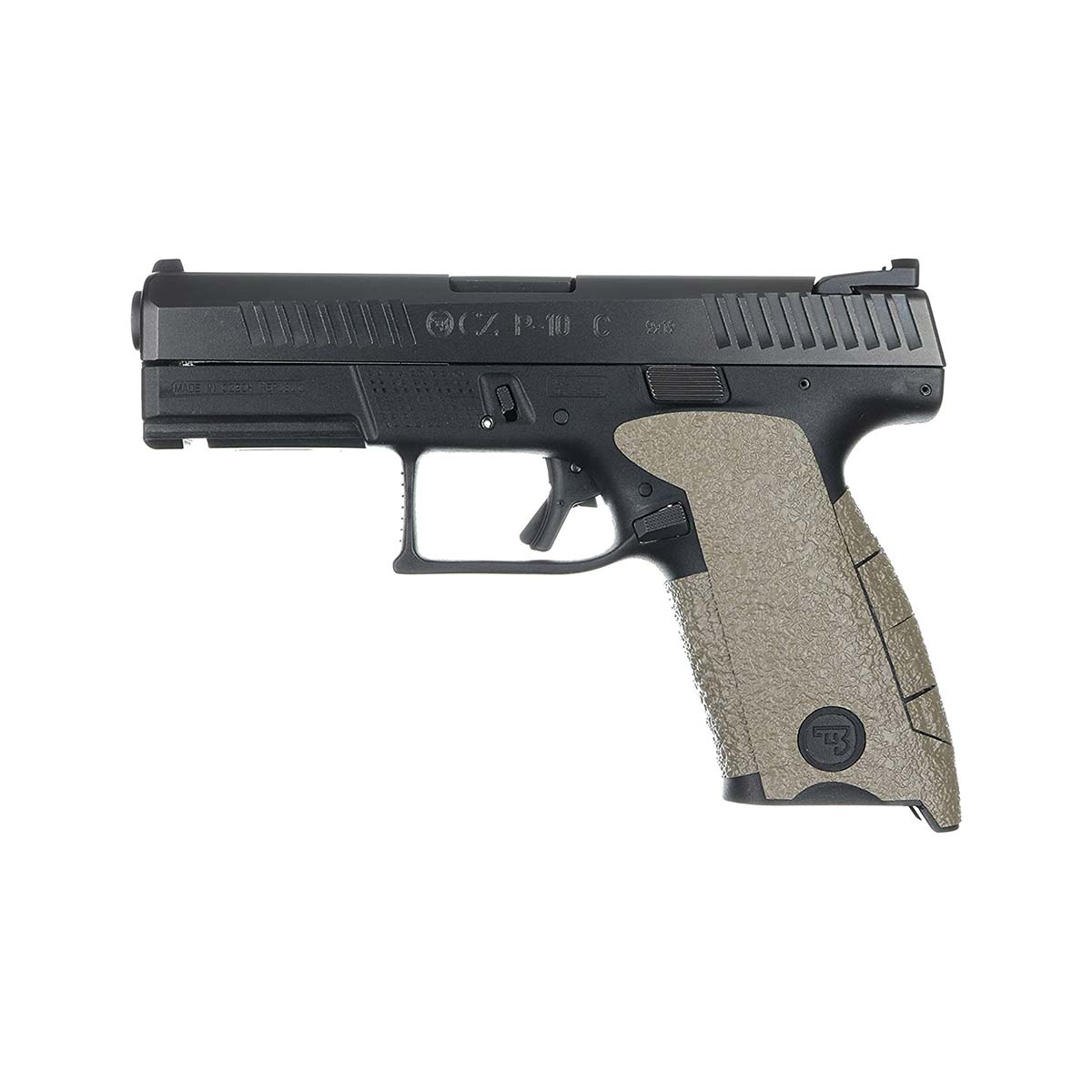 Grip caoutchouc sable pour CZ P10 compact 9mm large backstrap offrant une meilleure préhension en situation tactique ou pour le tir sportif. Le grip enserre partiellement la poignée de l'arme mais laisse apparent le logo CZ. Le grip caoutchouc améliore le confort de la poignée pistolet, sans avoir une surface abrasive rendant son utilisation agréable et idéale pour un port discret ou avec un holster inside.