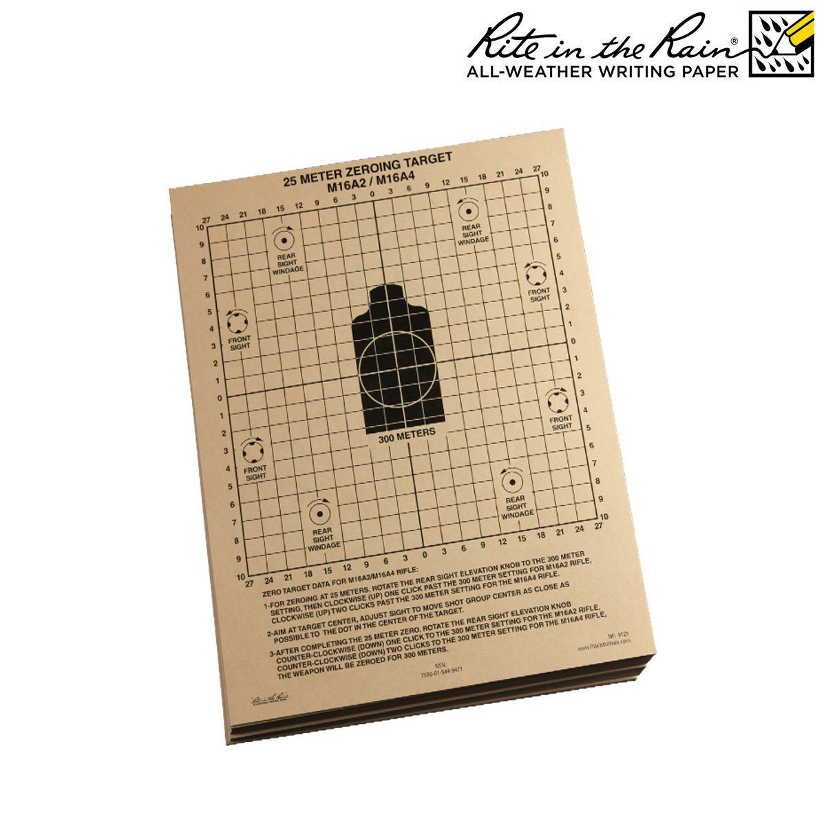 100 cibles de zérotage à 25 m pour M16A2 / M16A4 et carabine M4 imprimée des deux cotés. Le papier Rite In The Rain est de couleur sable, il résistera aux éléments (humidité, pluie, vent etc). Cette qualité permet un stockage dans un lieu humide.