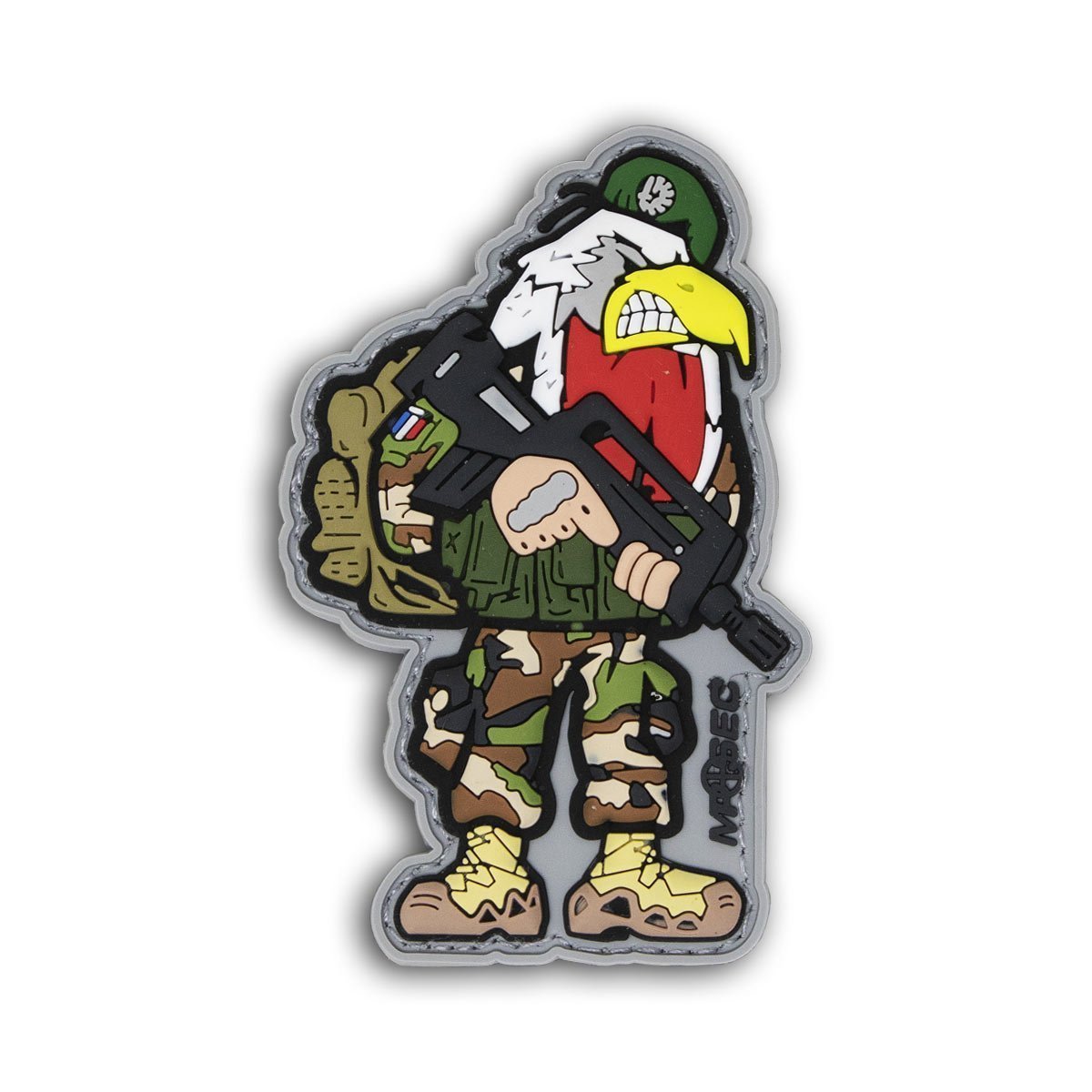 Nous avons souhaité mettre à l'honneur les membres de l'équipe et notre directeur, anciens légionnaires, ainsi que nos clients historiques et amis. Le coq est le symbole national français, il porte le béret vert des légionnaires, il est armé du FAMAS et il est équipé des produits phares de nos marques : un sac de combat BFM CamelBak, une tenue et un Chest Rig AMS Arktis, une paire de gants Oakley et une paire de chaussures LOWA Zéphyr.