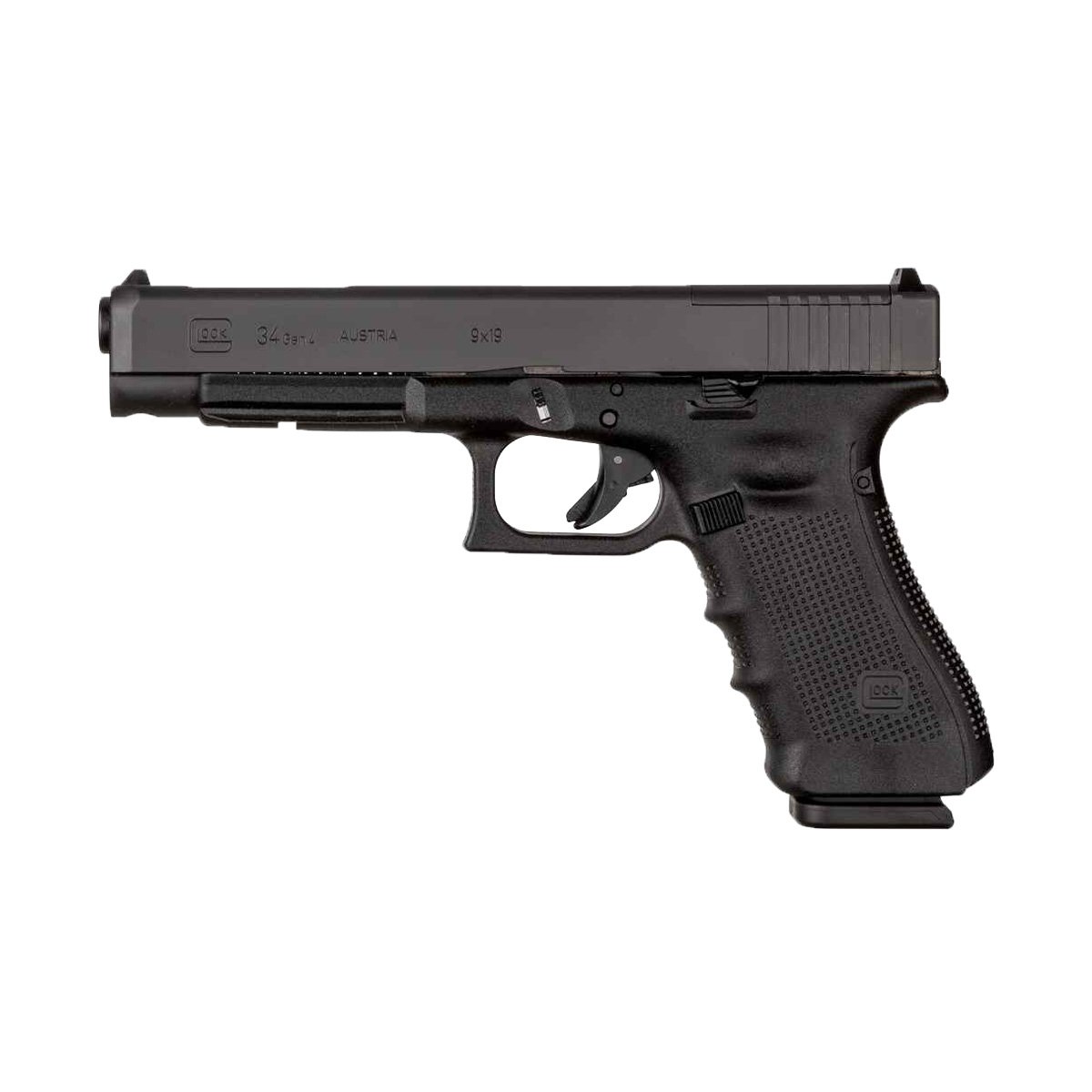 Le pistolet Glock 34 est une version sportive de la gamme des pistolets Glock, idéale pour le tir sur cible, le fun shoot ou encore l'IPSC. Les amateurs de Glock lui retrouveront la prise en main et les fonctionnalités spécifiques à la marque, avec en prime un canon long et des organes de visée réglables. On retrouve les caractéristiques principales des pistolets Glock, avec toutefois quelques améliorations et équipements trahissant nettement l'orientation sportive du G34 : Le canon du Glock 37 mesure 135 mm, contre 117 mm pour celui du Glock 17. Le guidage des projectiles s'en trouve sensiblement amélioré, ce à quoi l'on peut ajouter l'efficacité de son profil interne polygonal plus durable et facile d'entretien. La glissière est également allongée, mais aussi ajourée sur sa partie supérieure pour refroidir le canon lors de séances de tir répétés, tout en allégeant son poids vers l'avant. La ligne de visée est ainsi plus importante, et la hausse fournie est réglable en hauteur et dérive pour un ajustement précis de vos tirs. La détente Safe Action est équipée de série d'un connecteur moins qui réduit son poids à 2 kg, soit 500 grammes de moins qu'un Glock 17 classique. Toujours pour améliorer votre réactivité en situation de tir rapide, on peut noter la présence d'un arrêtoir de culasse rallongé et un bouton de déverrouillage du chargeur agrandi. Ces caractéristiques rendent la manipulation plus aisée dans des disciplines où la vitesse est un atout.