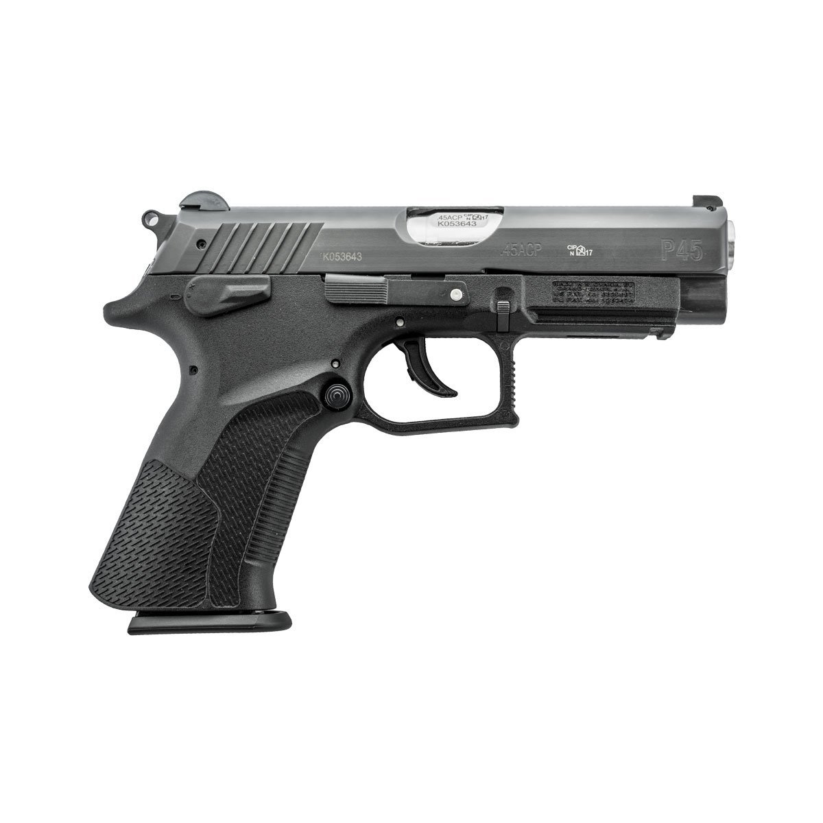 Le P45 est un pistolet fonctionnant en mode Simple Action/Double Action avec un canon rotatif pour un recul extrêmement faible. Il possède une forme ergonomique et toutes les commandes sont ambidextres permettant un confort au tir pour les droitiers comme les gauchers. Le système de verrouillage du canon unique en son genre est devenu populaire parmi les tireurs du monde entier. Le système de canon rotatif est protégé par des brevets internationaux. Construit sur la dernière génération de carcasse en polyamide Mk12, doté d’un nouveau loquet de démontage en acier. Cette innovation se traduit par une poignée plus solide, une fiabilité améliorée et un démontage plus facile. L’apparence du pistolet à glissière incurvée ressemble à un calibre .45 type 1911 et offre une excellente maniabilité et ergonomie. Comparé à ses concurrents le recul est minimisé. L'acier est traité thermiquement jusqu'à une dureté de 40-42 HRC.