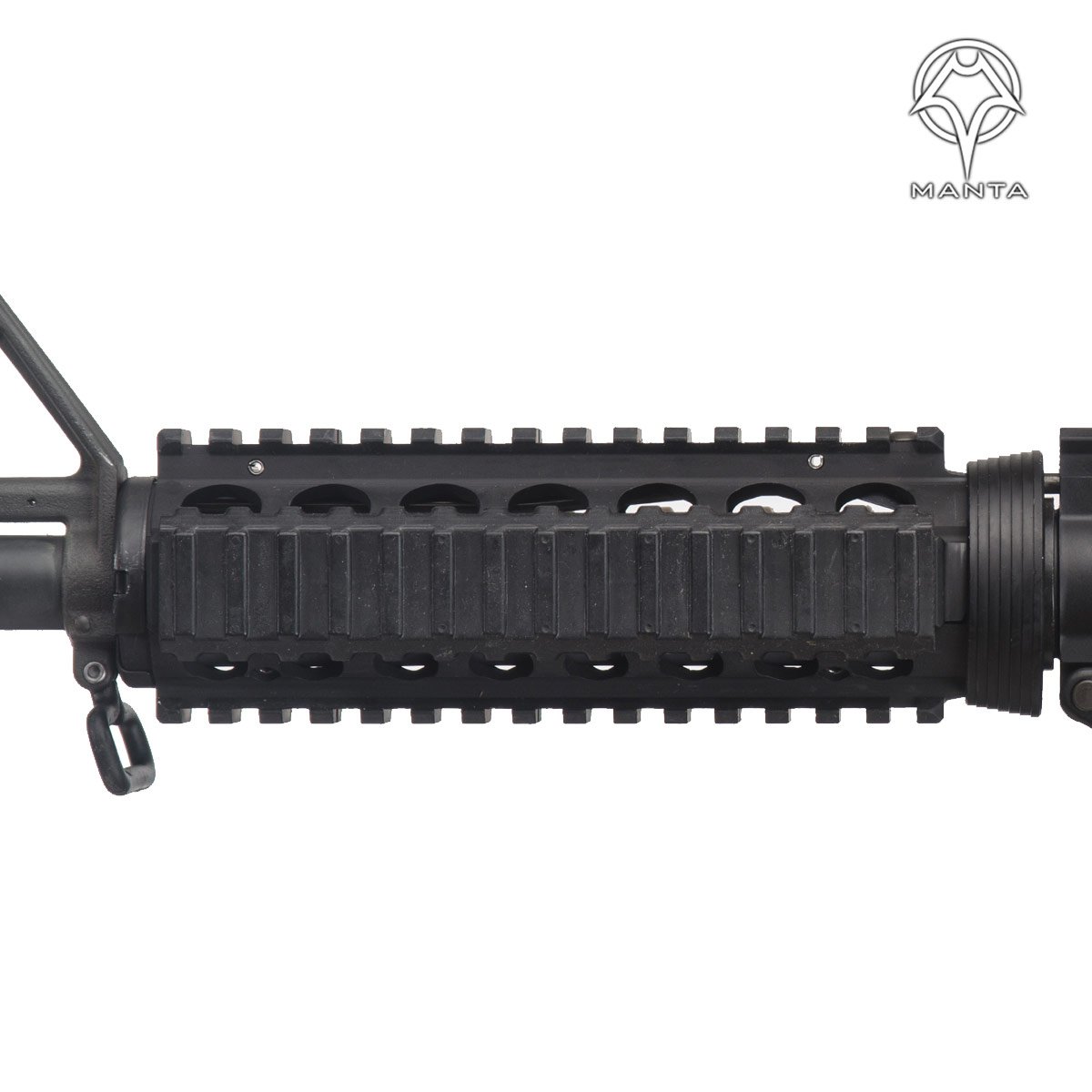 Le rail de protection noir simple permet de protéger 1 rail Picatinny de la plateforme M4. C'est une solution simple pour couvrir les rails type Mil Std 1913 du garde main de l'arme. Tous les protège-rails Manta offrent une très bonne sensation tactile et une résistance à la chaleur extrême qui est engendrée par un tir soutenu et automatique. En couvrant le rail supérieur on élimine la vue mirage générée par la chaleur du tir.